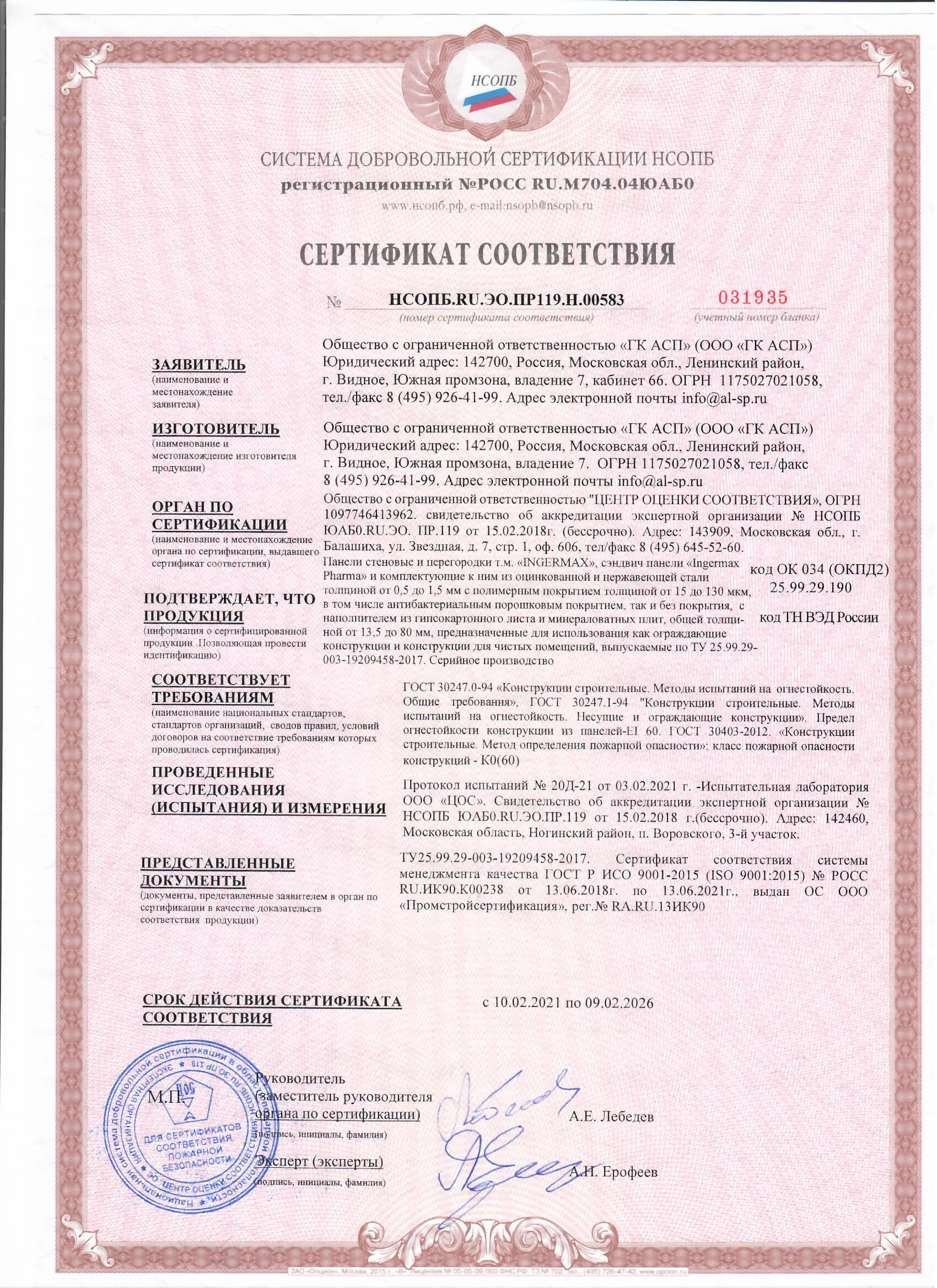 Панели стеновые и перегородки т.м. "Ingermax" сэдвич панели "Ingermax Pharma" и комплектующие к ним из оцинкованной и нержавеющей стали толщиной от 0,5 до 1,5 мм с полимерным покрытием толщиной от 15 до 300 мкм, в том числе антибактериальным покрытием, так и без покрытия, с наполнением из гипсокартонного листа и минеральных плит, общей толщиной от 13,5 до 80 мм, предназначеннные для использования, как ограждающие конструкции и конструкции для чистых помещений, выпускаемые по ТУ 25.99.29-003-19209458-2017.